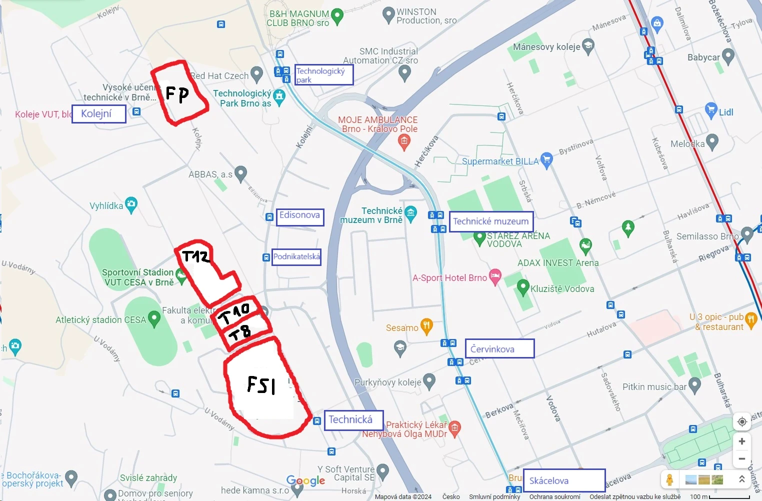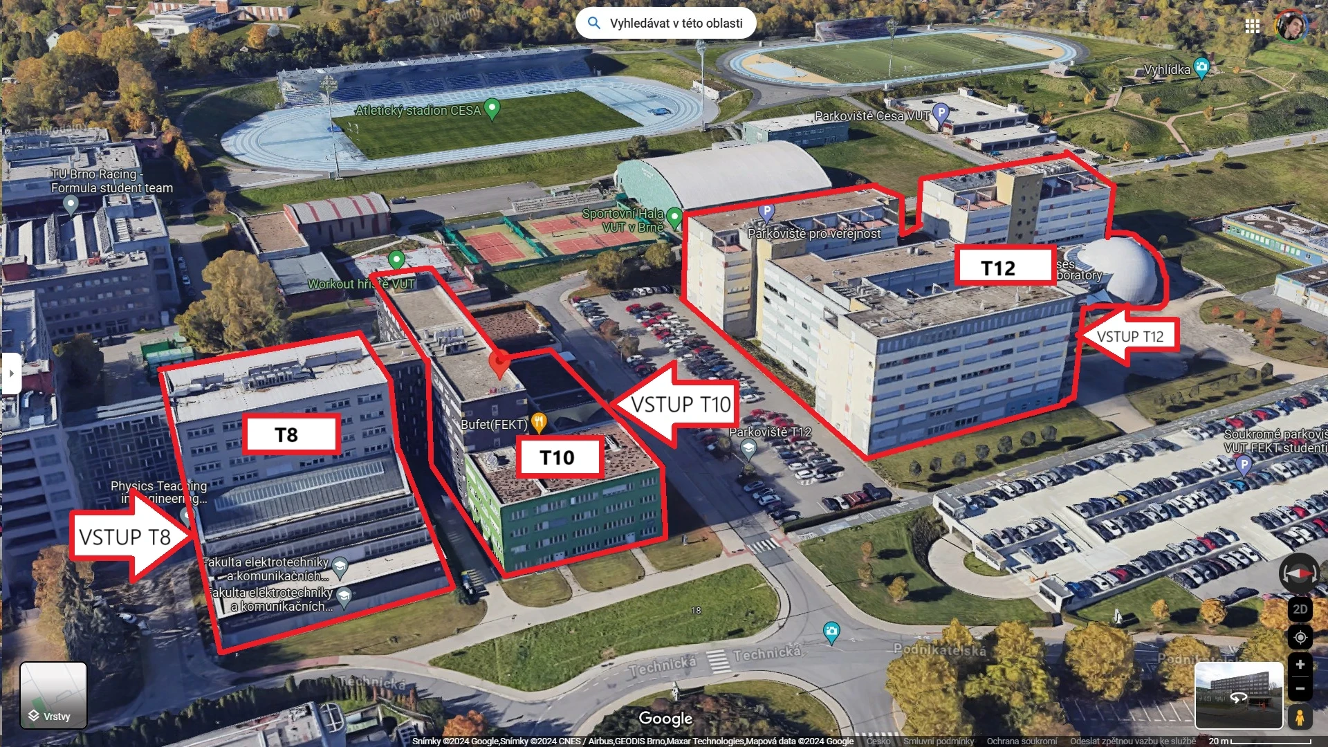 Mapa: budovy T8, T10, T12 na mapě, vyznačené zastávky