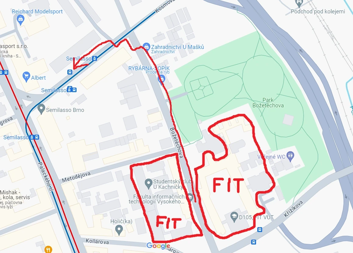 Pokud jedete z FITu, bežte na zastávku Semilasso a na FEKT se dostanete autobusem 72. Na 72 nastupte ze strany blíž k Albertu.